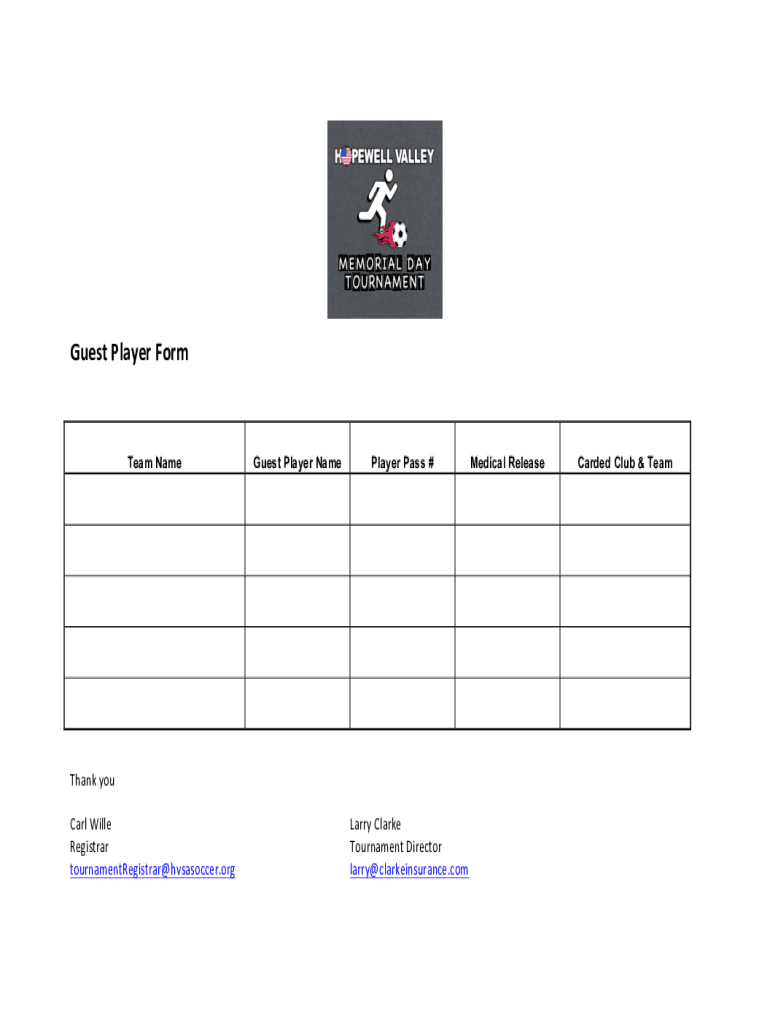 GuestPlayerFormTeam Nameless Player Nameplate Pass #Medical Release Thank you, Carlisle Registrar tournamentRegistrar hvsasoccer.orgLarryClarke TournamentDirector Larry clarkeinsurance. Compared Club