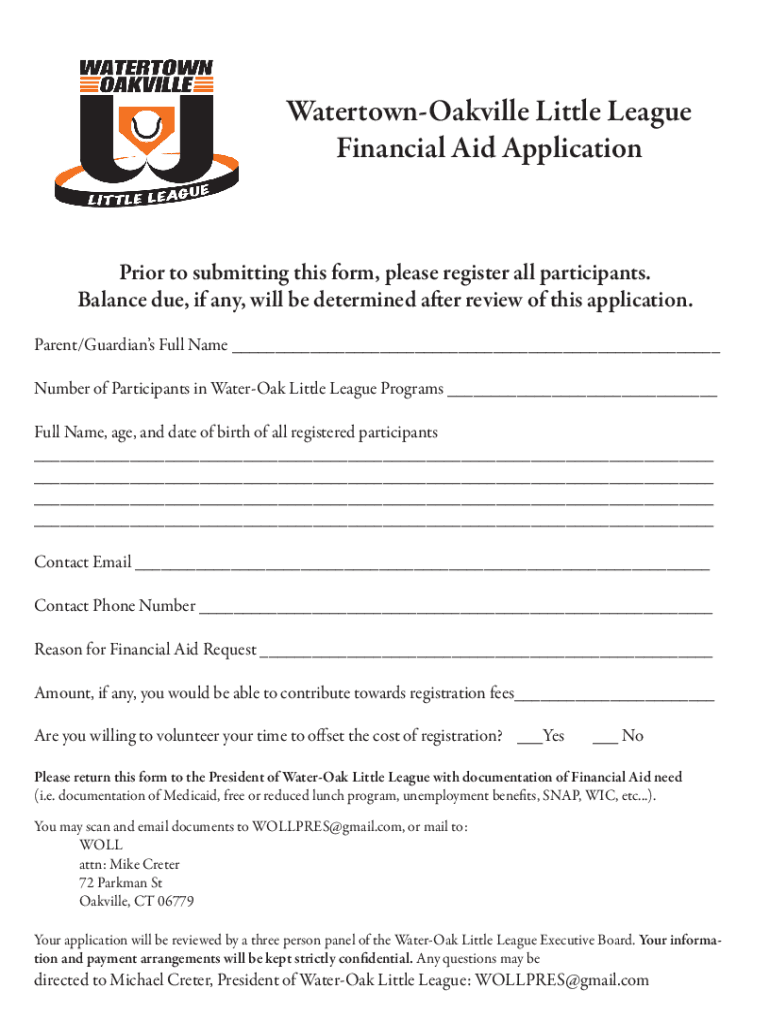 WatertownOakville Little League Financial Aid ApplicationPrior to submitting this form, please register all participants. Balance due, if any, will be determined after review of this application.