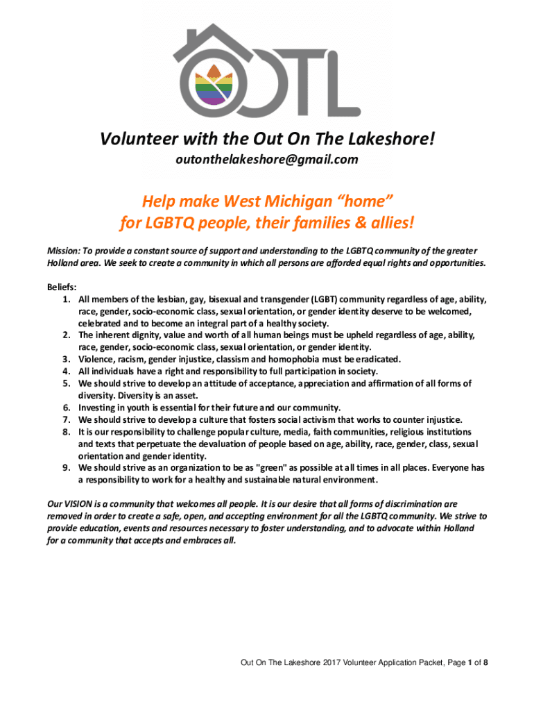 Volunteer with the Out On The Lake shore! Outonthelakeshore Gmail. Compel make West Michigan home for LGBTQ people, their families & allies! Mission: To provide a constant source of support and understanding