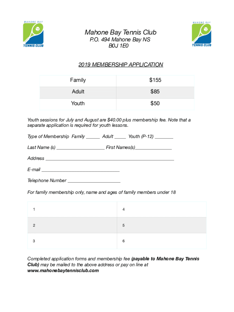 Malone Bay Tennis Club P.O. 494 Malone Bay NS B0J 1E02019 MEMBERSHIP APPLICATION Family$155Adult$85Youth$50Youth sessions for July and August are $40.00 plus membership fee. Note that a separate application