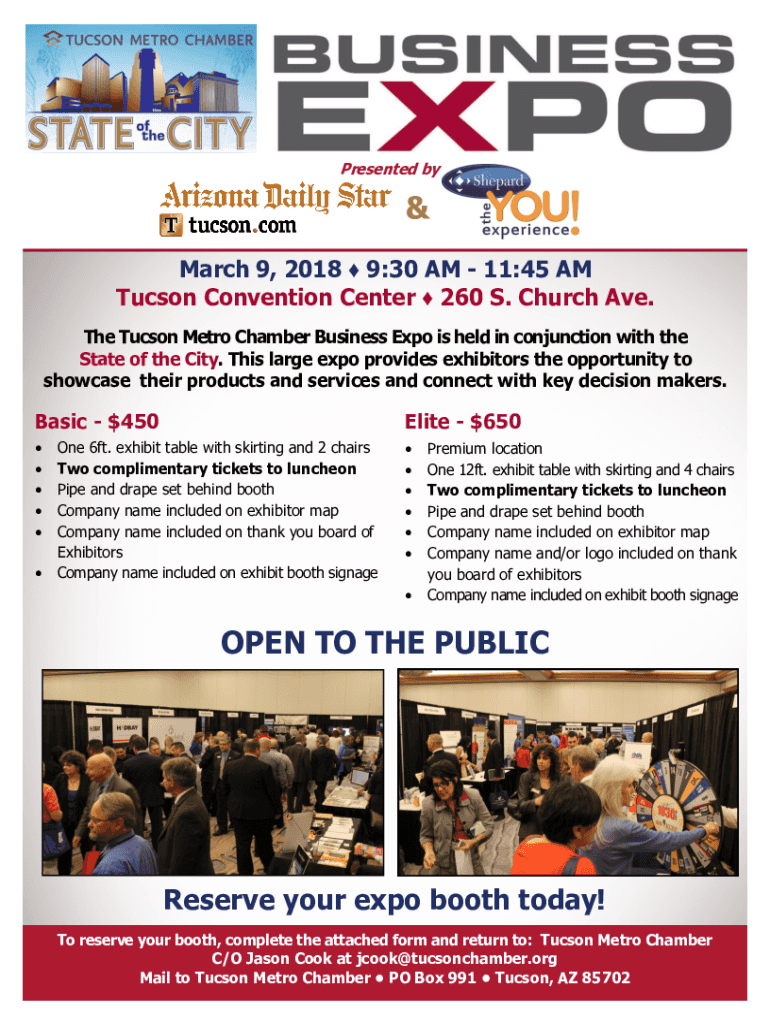 Presented by March 9, 2018 9:30 AM 11:45 AM Tucson Convention Center 260 S. Church Ave. The Tucson Metro Chamber Business Expo is held in conjunction with the State of the City. This large expo provides