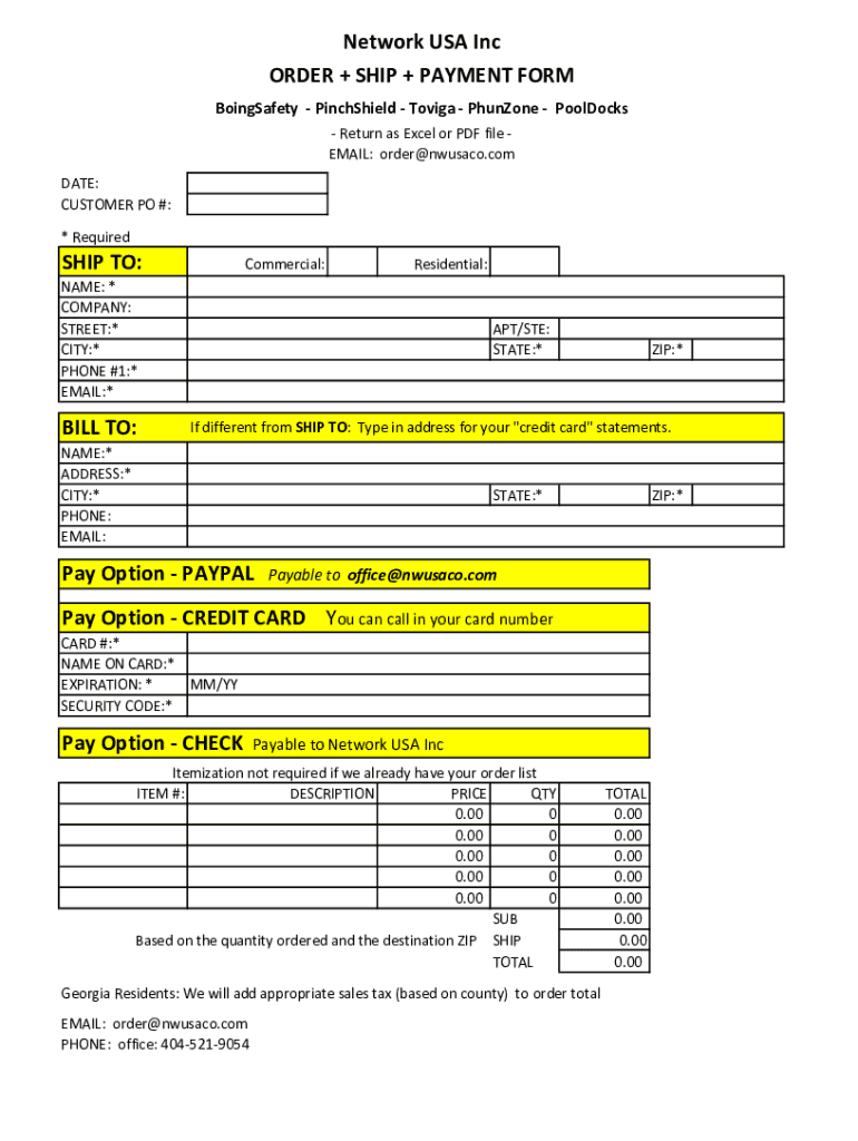 Network USA Inc ORDER + SHIP + PAYMENT FORM Biosafety Windshield Tonga Phone Boondocks Return as Excel or PDF file EMAIL: order nwusaco.com DATE: CUSTOMER PO #: * RequiredSHIP TO:Commercial:Residential:NAME: