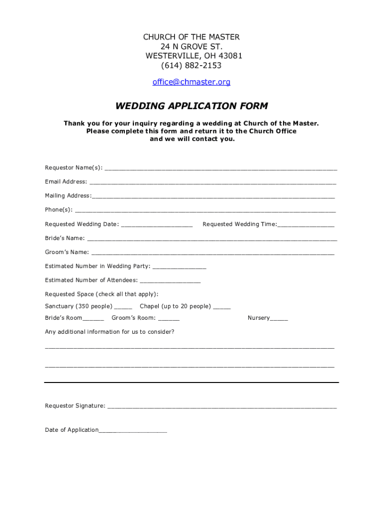 CHURCH OF THE MASTER 24 N GROVE ST. WESTERVILLE, OH 43081 (614) 8822153 office chaster. Rewedding APPLICATION FORM Thank you for your inquiry regarding a wedding at Church of the Master. Please complete