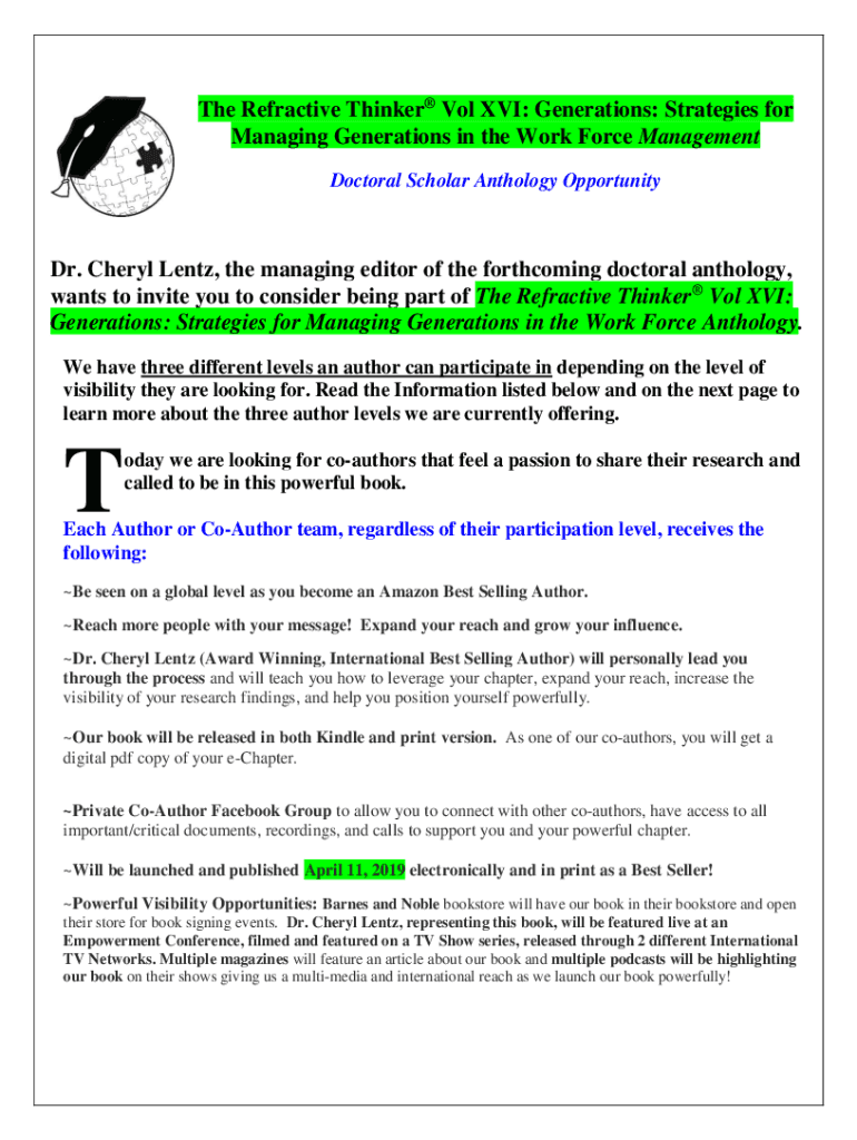 Doctoral Scholar Anthology Opportunity Dr. Cheryl Lent, the managing editor of the forthcoming