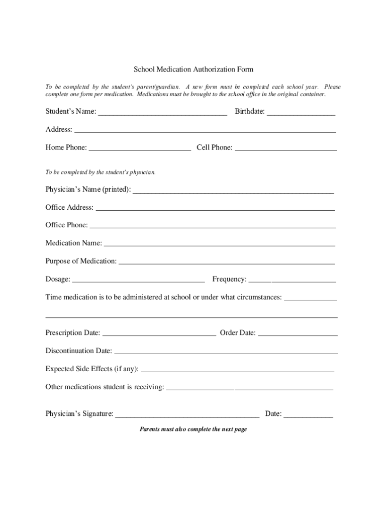 School Medication Authorization Form To be completed by the students parent/guardian. A new form must be completed each school year. Please complete one form per medication. Medications must be brought