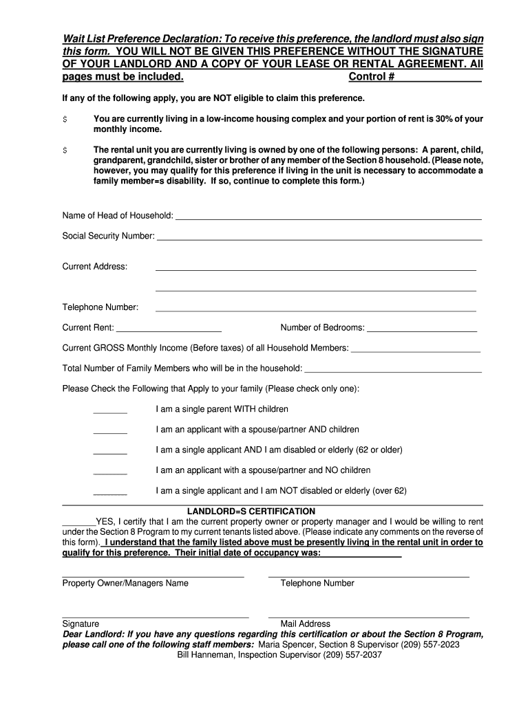To complete the Section 8 Wait List Preference Declaration, you typically need personal identification, proof of income, information about household members, and, if applicable, landlord certification.