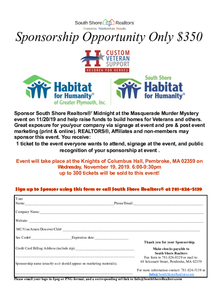 Sponsorship Opportunity Only $350Sponsor South Shore Realtors Midnight at the Masquerade Murder Mystery event on 11/20/19 and help raise funds to build homes for Veterans and others. Great exposure