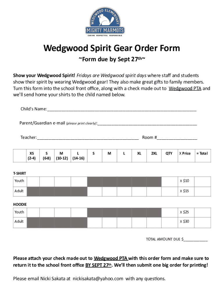 Wedgwood Spirit Gear Order Former due by Sept 27thShow your Wedgwood Spirit! Fridays are Wedgwood spirit days when STA and students show their spirit by wearing Wedgwood gear! They also make great