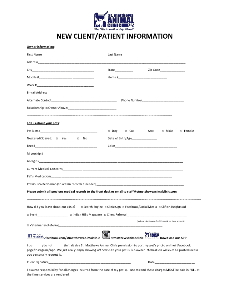 Get the free NEW CLIENT/PATIENT INFORMATION - St. Matthews Animal Clinic