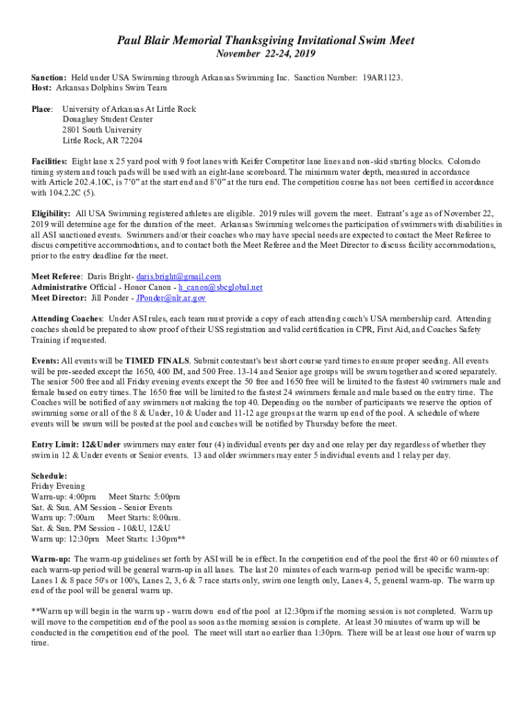 Sanction: Held under USA Swimming through Arkansas Swimming Inc. Sanction Number: 19AR1123.