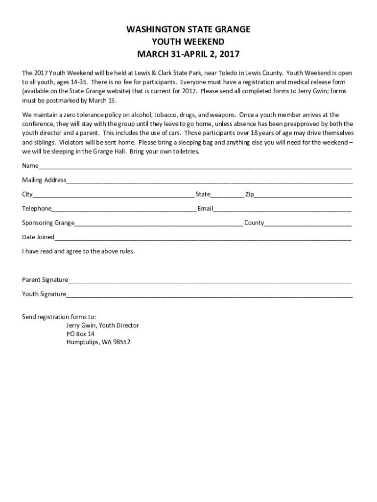 WASHINGTON STATE GRANGE YOUTH WEEKEND MARCH 31APRIL 2, 2017 The 2017 Youth Weekend will be held at Lewis & Clark State Park, near Toledo in Lewis County. Youth Weekend is open to all youth, ages 1435.