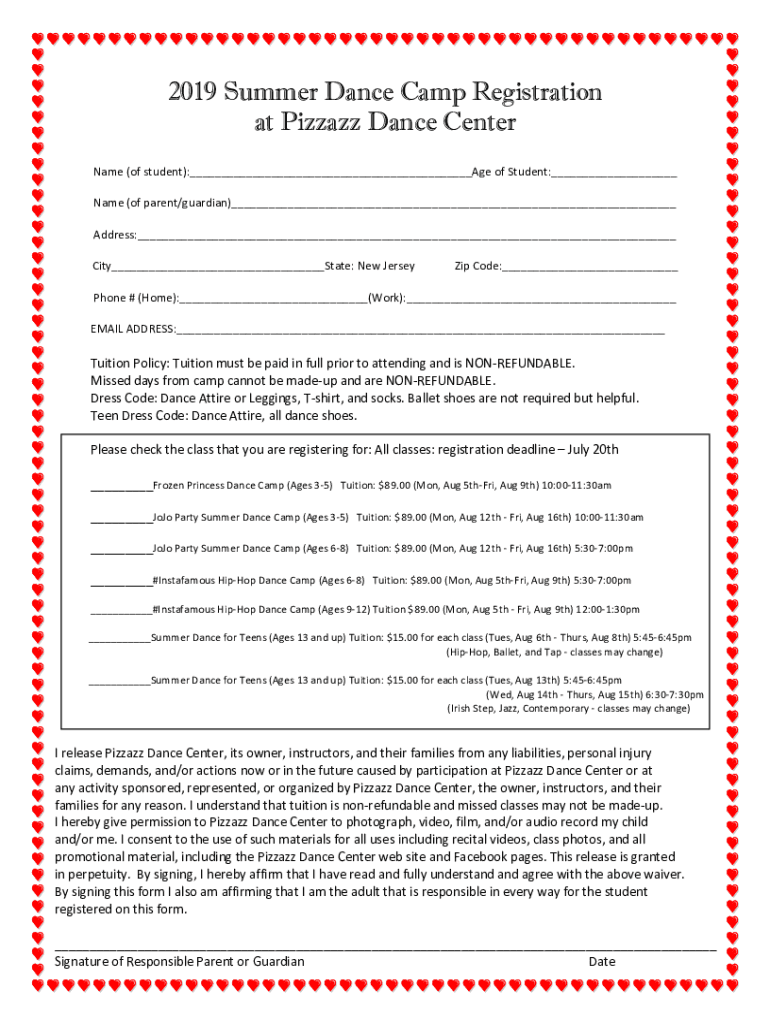 2019 Summer Dance Camp Registration at Pizzazz Dance Center Name (of student): Age of Student: Name (of parent/guardian) Address: City State: New Jersey Code: Phone # (Home): (Work): EMAIL ADDRESS:
