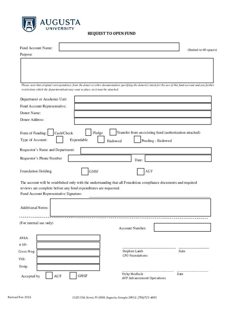 REQUEST TO OPEN FUND Account Name:(limited to 60 spaces)Purposeless note that original correspondence from the donor or other documentation specifying the donor(s) intent for the use of this fund