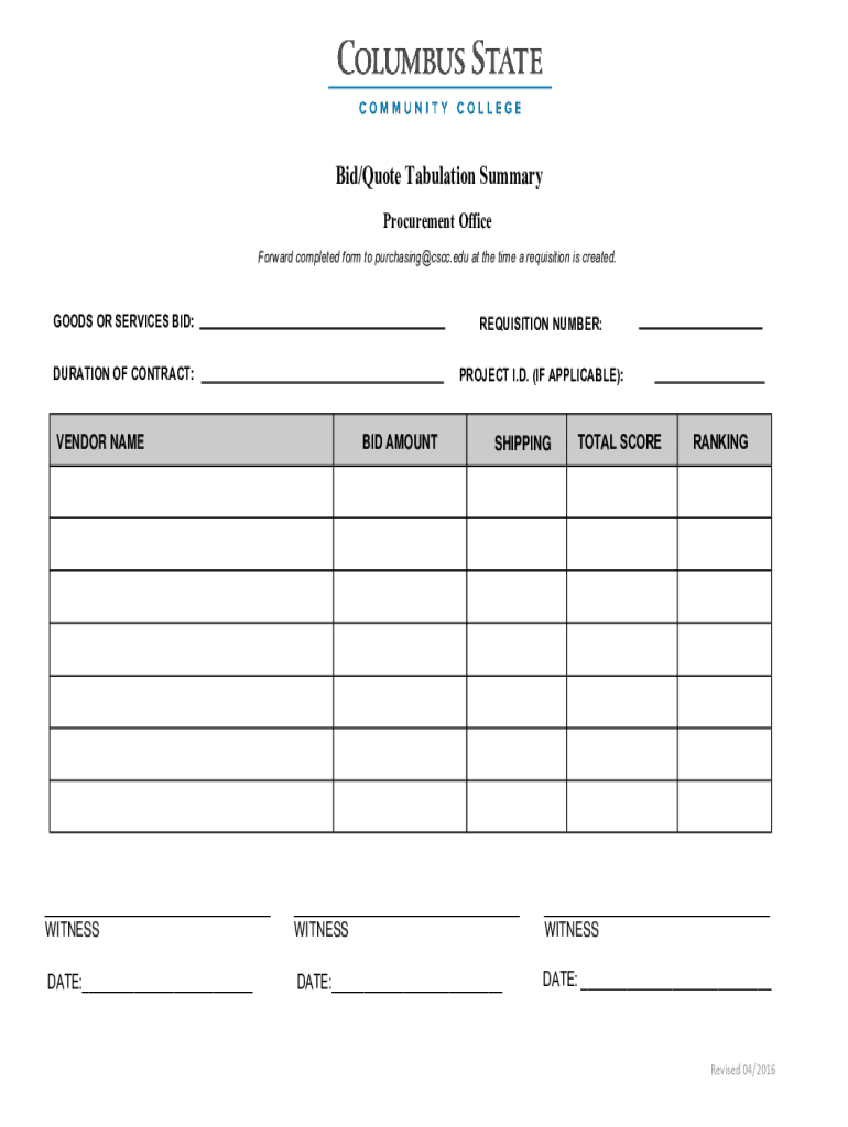 Bid/Quote Tabulation Summary Procurement Office Forward completed form to purchasing CCC.edu at the time a requisition is created. GOODS OR SERVICES BID:REQUISITION NUMBER:DURATION OF CONTRACT:PROJECT
