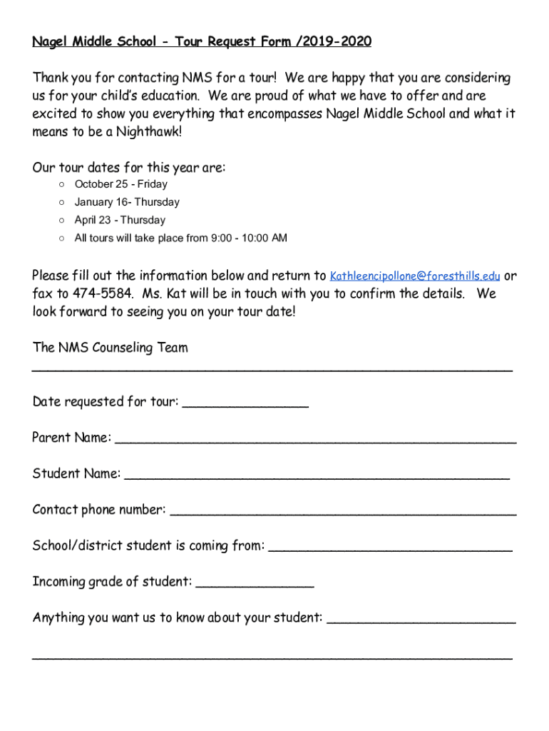 Nagel Middle School Tour Request Form /20192020 Thank you for contacting NHS for a tour! We are happy that you are considering us for your children education. We are proud of what we have to offer