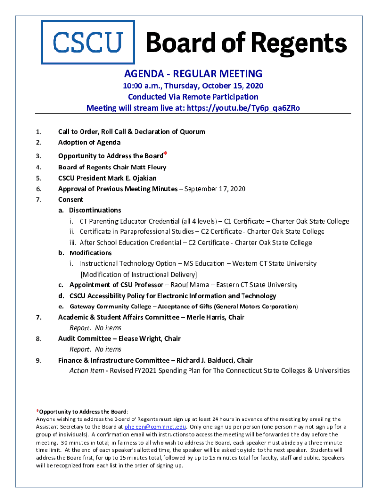 AGENDA REGULAR MEETING10:00 a.m., Thursday, October 15, 2020,