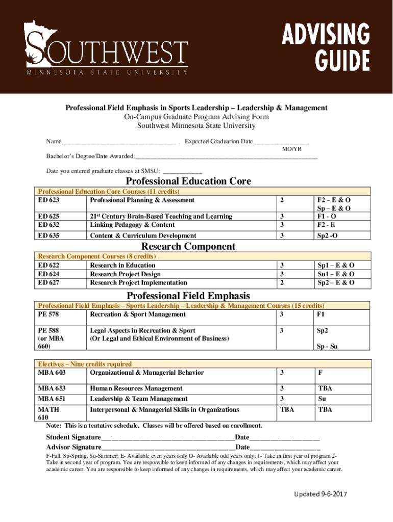 Professional Field Emphasis in Sports Leadership & Management Campus Graduate Program Advising Form Southwest Minnesota State University Name Expected Graduation Date MO/Bachelors Degree/Date Awarded:
