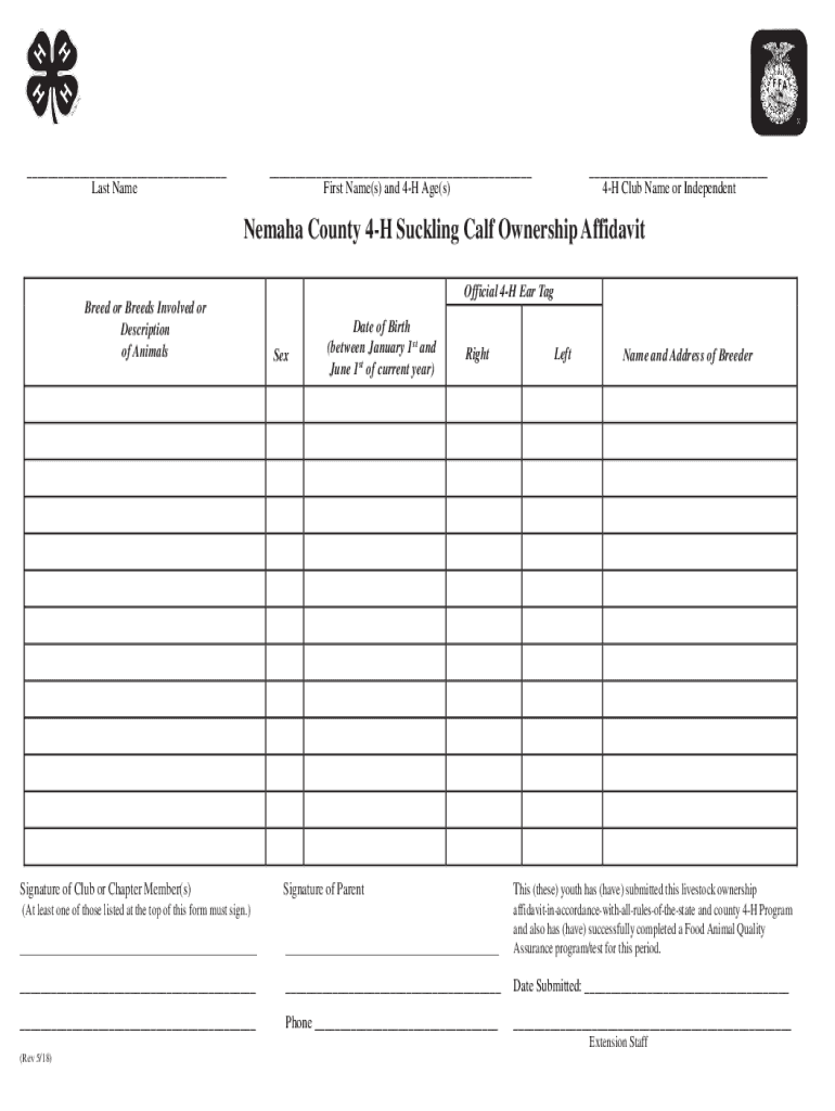 Last Name First Name(s) and 4H Age(s) 4H Club Name or IndependentNemaha County 4H Suckling Calf Ownership Affidavit Breed or Breeds Involved or Description of AnimalsSignature of Club or Chapter Member(s)Official
