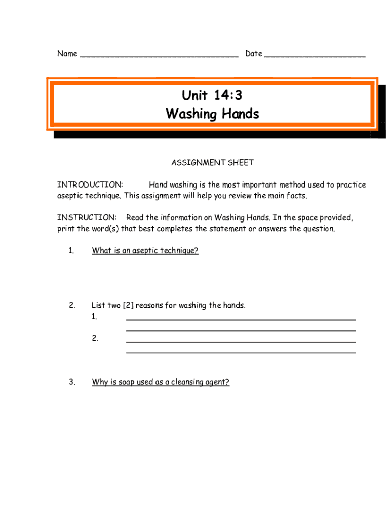 Name Date Unit 14:3 Washing HandsASSIGNMENT SHEET INTRODUCTION: Handwashing is the most important method used to practice aseptic technique. This assignment will help you review the main facts. INSTRUCTION: