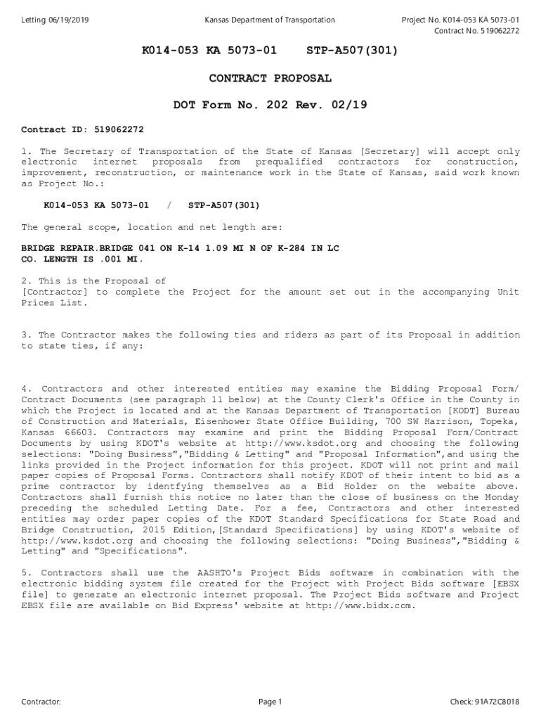 Letting 06/19/2019Kansas Department of TransportationK014053 A 507301Project No. K014053 A 507301 Contract No. 519062272STPA507(301)CONTRACT PROPOSAL DOT Form No. 202 Rev. 02/19 Contract ID: 519062272