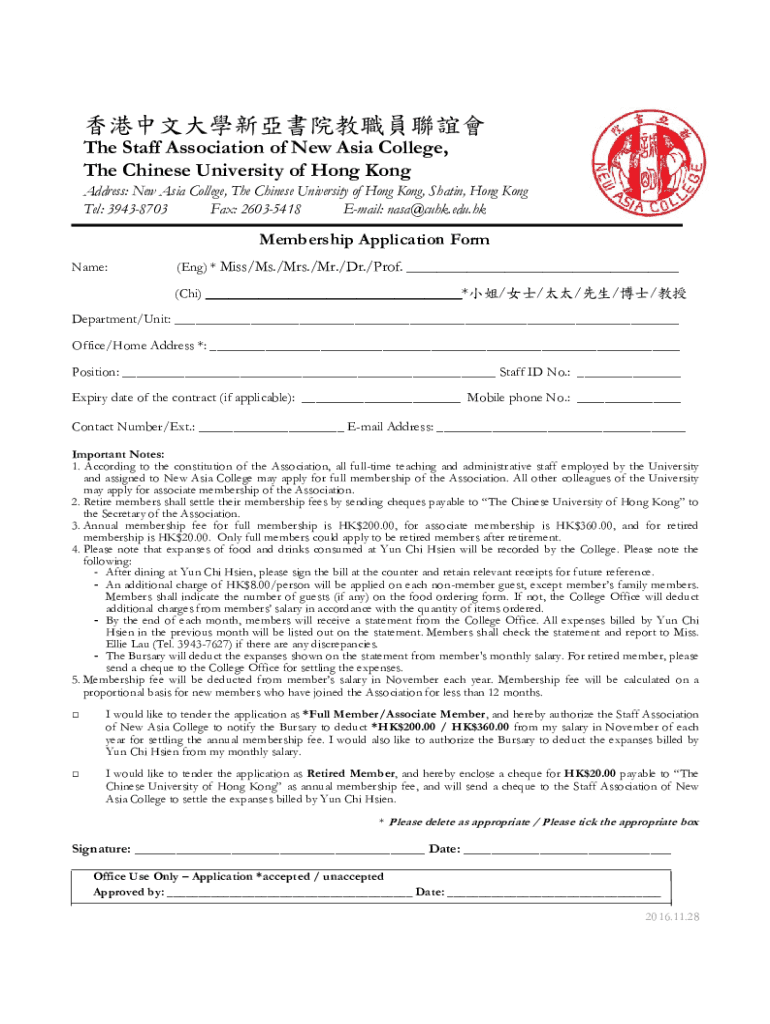 The Staff Association of New Asia College, The Chinese University of Hong KongAddress: New Asia College, The Chinese University of Hong Kong, Satin, Hong Kong Tel: 39438703 Fax: 26035418 Email: NASA