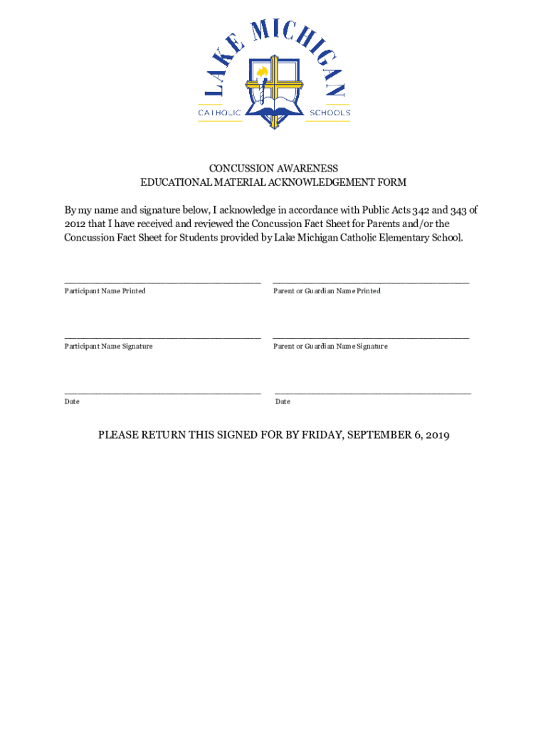 CONCUSSION AWARENESS EDUCATIONAL MATERIAL ACKNOWLEDGEMENT FORM By my name and signature below, I acknowledge in accordance with Public Acts 342 and 343 of 2012 that I have received and reviewed the
