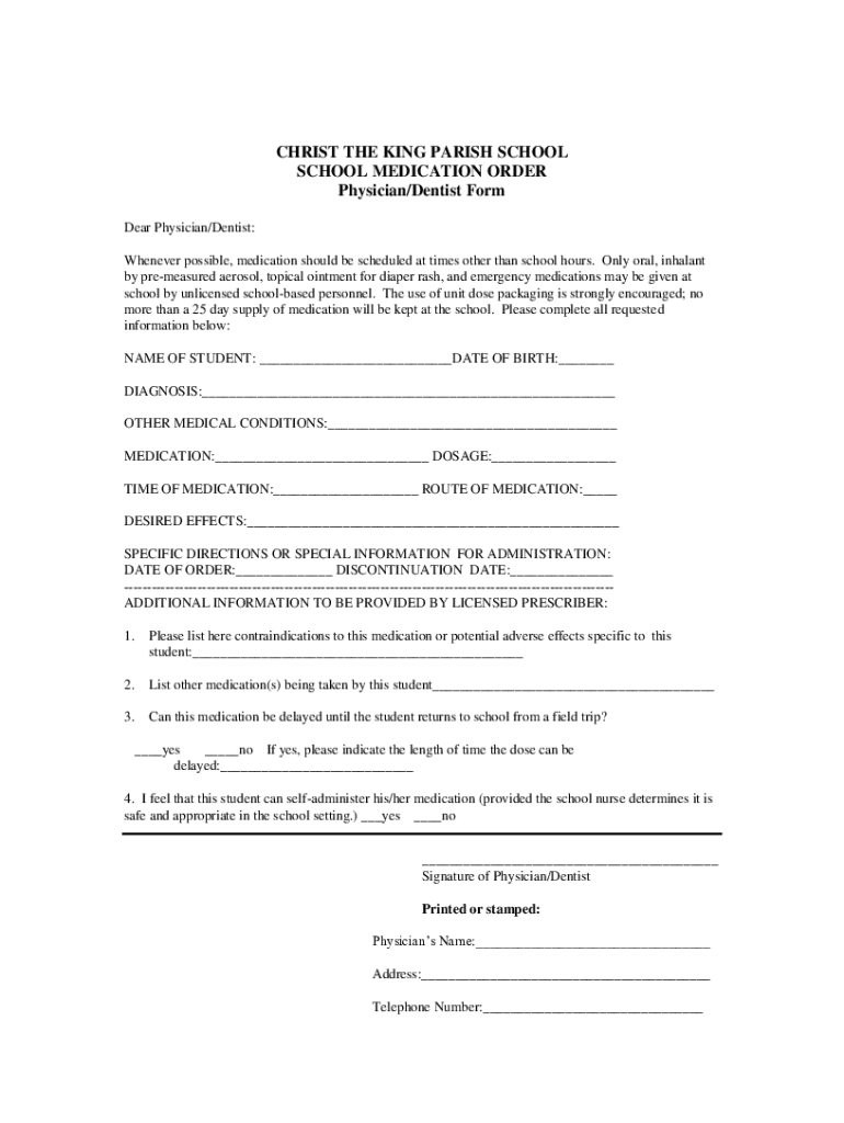 CHRIST THE KING PARISH SCHOOL MEDICATION ORDER