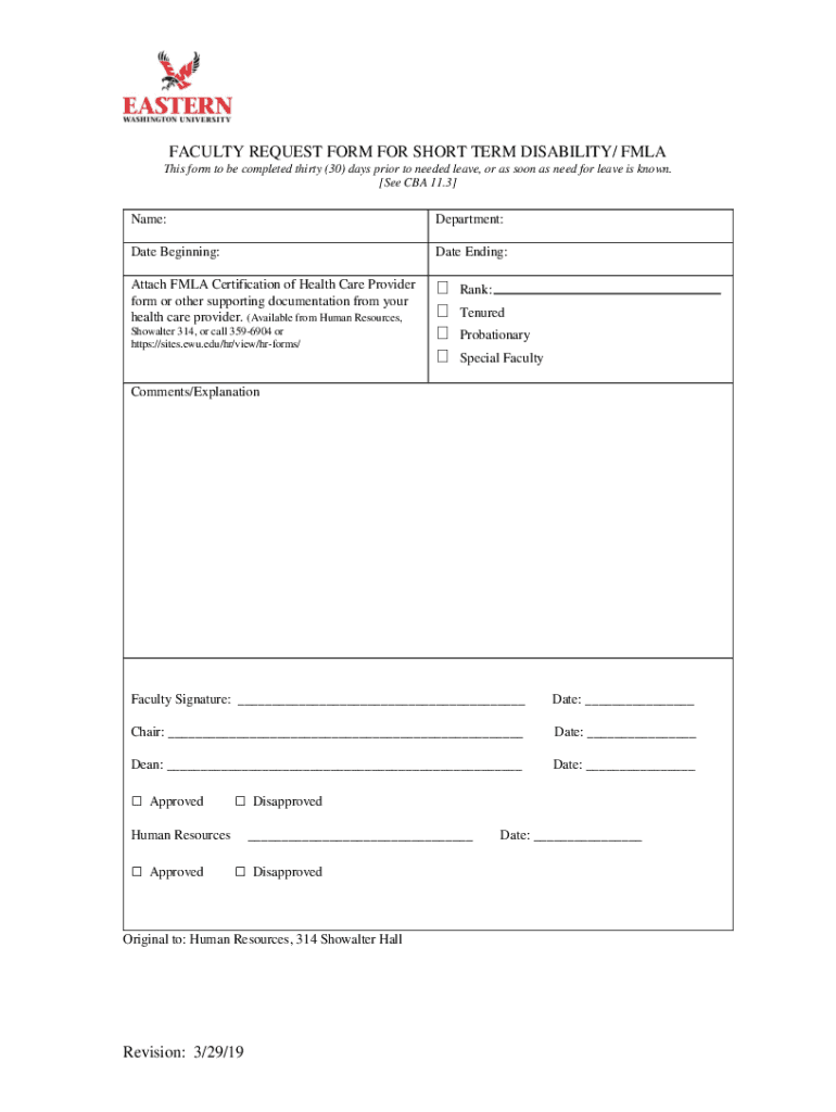 FACULTY REQUEST FORM FOR SHORT TERM DISABILITY/ FMLA This form to be completed thirty (30) days prior to needed leave, or as soon as need for leave is known. See CBA 11.3 Name:Department:Date Beginning:Date
