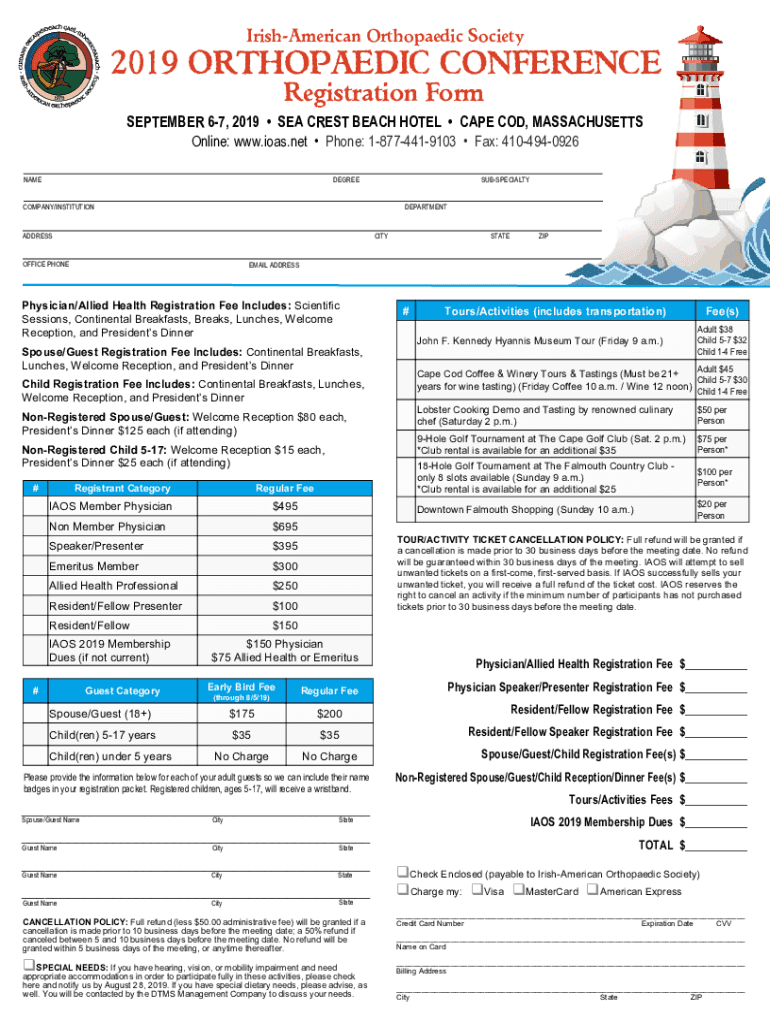 Irish American Orthopedic Society2019 Orthopedic CONFERENCE Registration FormSEPTEMBER 67, 2019 SEA CREST BEACH HOTEL CAPE COD, MASSACHUSETTS Online: www.ioas.net Phone: 18774419103 Fax: 4104940926