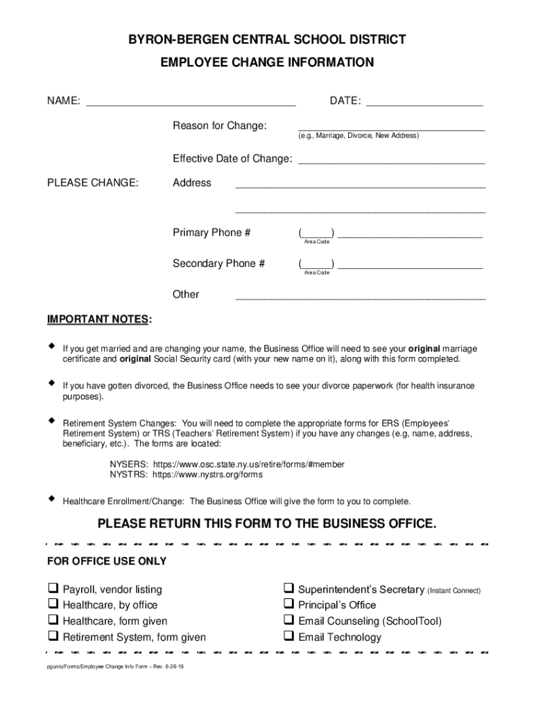 BYRONBERGEN CENTRAL SCHOOL DISTRICT EMPLOYEE CHANGE INFORMATION NAME: Reason for Change:DATE: (e.g., Marriage, Divorce, New Address)Effective Date of Change: PLEASE CHANGE:Address Primary Phone #()