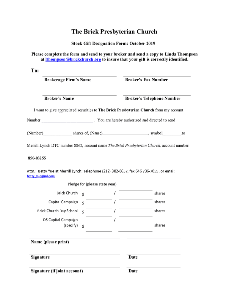 The Brick Presbyterian Church Stock Gift Designation Form: October 2019 Please complete the form and send to your broker and send a copy to Linda Thompson at Thompson brick church.org to ensure that