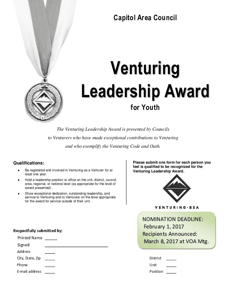 Fill out your venturing leadership award online with pdfFiller!