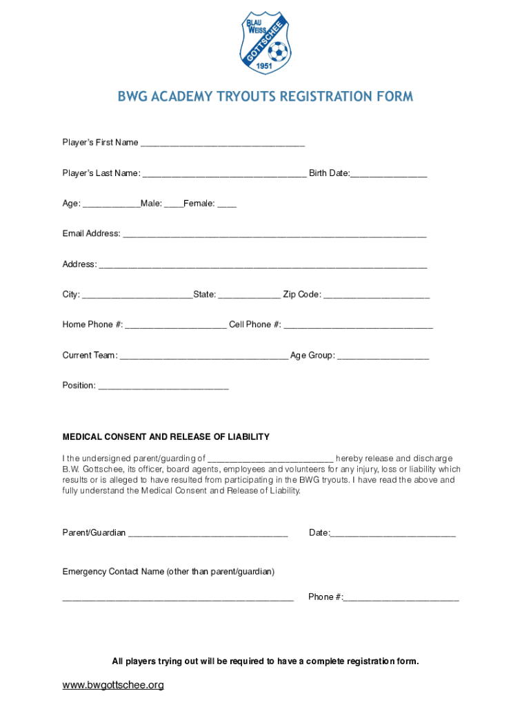 BWG ACADEMY TRYOUTS REGISTRATION FORM Players First Name Players Last Name: Birth Date: Age: Male: Female: Email Address: Address: City: State: Zip Code: Home Phone #: Cell Phone #: Current Team:
