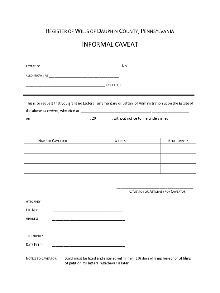 REGISTER OF WILLS OF DAUPHIN COUNTY, PENNSYLVANIAINFORMAL CAVEAT ESTATE OF NO. ALSO KNOWN AS, DECEASEDThis is to request that you grant no Letters Testamentary or Letters of Administration upon the