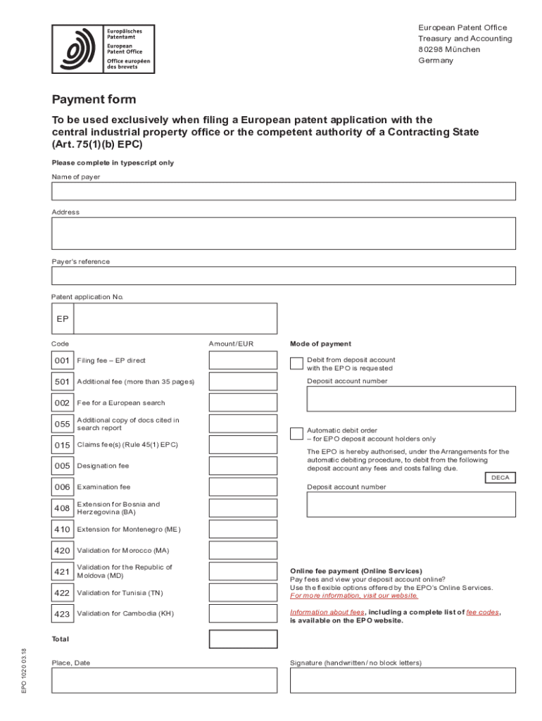 Anyone who needs to make a payment to the European Patent Office (EPO) can use the EPO payment form 03-18.