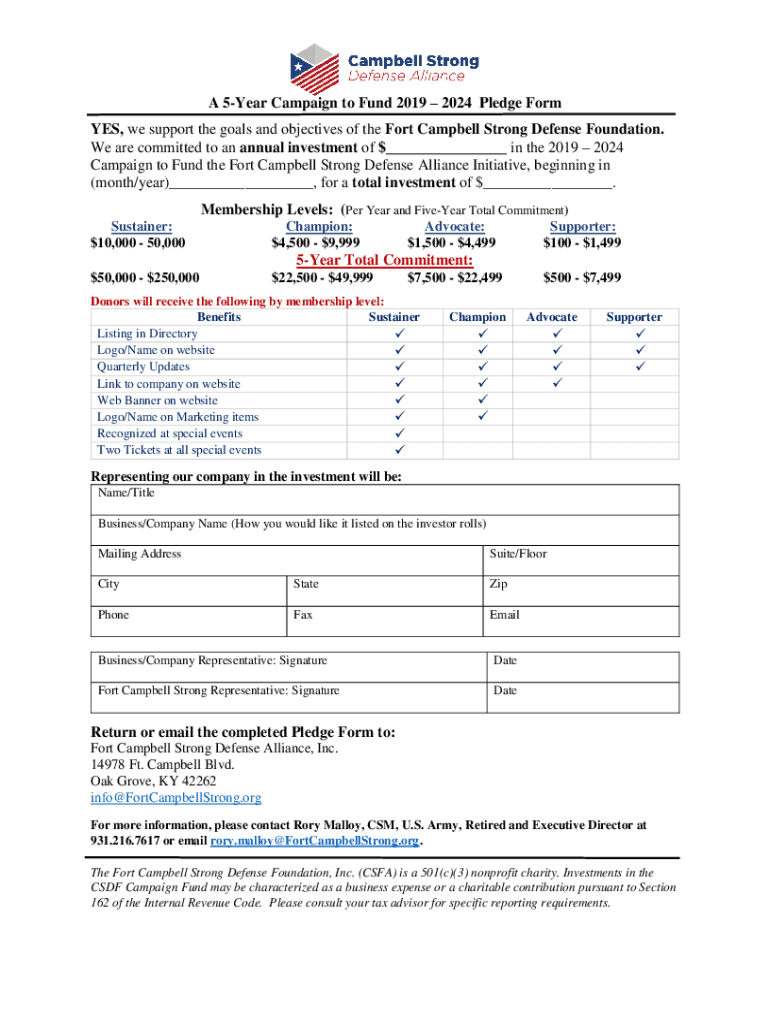 A 5Year Campaign to Fund 2019 2024 Pledge Form YES, we support the goals and objectives of the Fort Campbell Strong Defense Foundation. We are committed to an annual investment of $ in the 2019 2024