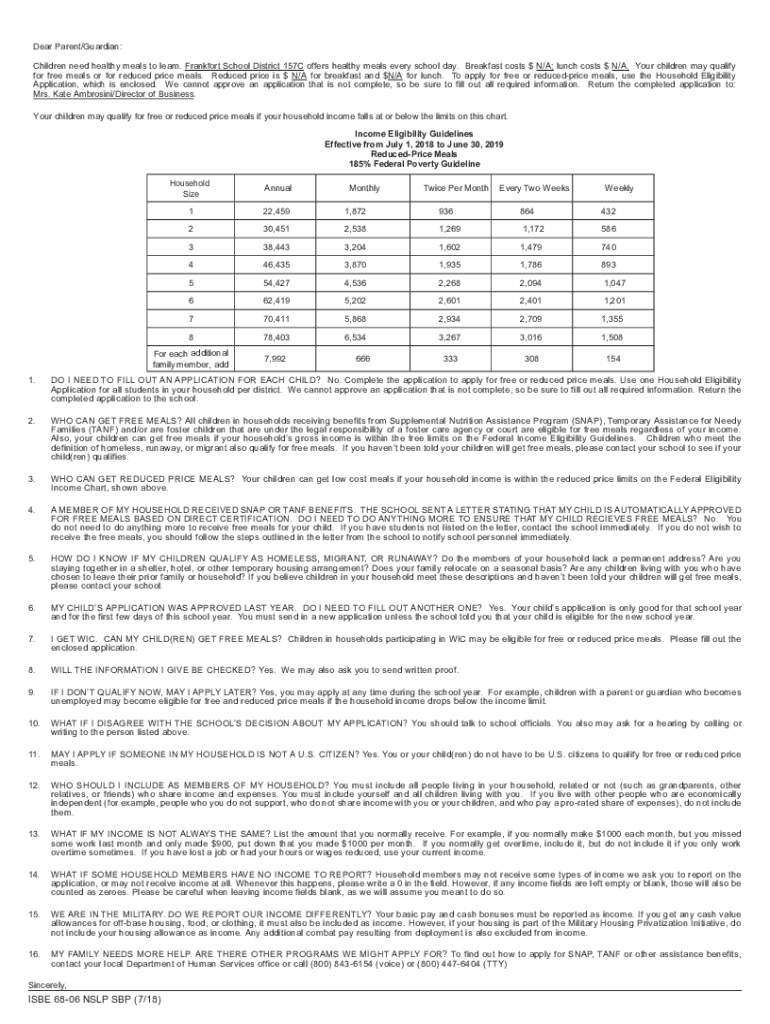 Children need healthy meals to learn. Frankfort School District 157C offers healthy meals every school day. Breakfast costs $ N/A; lunch costs $ N/A. Your children may qualify