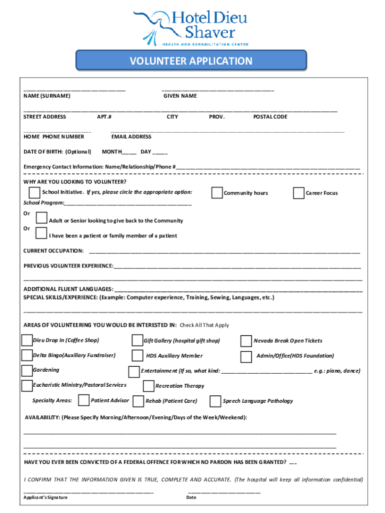 VOLUNTEER APPLICATION NAME (SURNAME)GIVEN NAME STREET ADDRESS APT.#CITRON.POSTAL CODE HOME PHONE NUMBEREMAIL ADDRESSABLE OF BIRTH: (Optional)MONTH DAY Emergency Contact Information: Name/Relationship/Phone