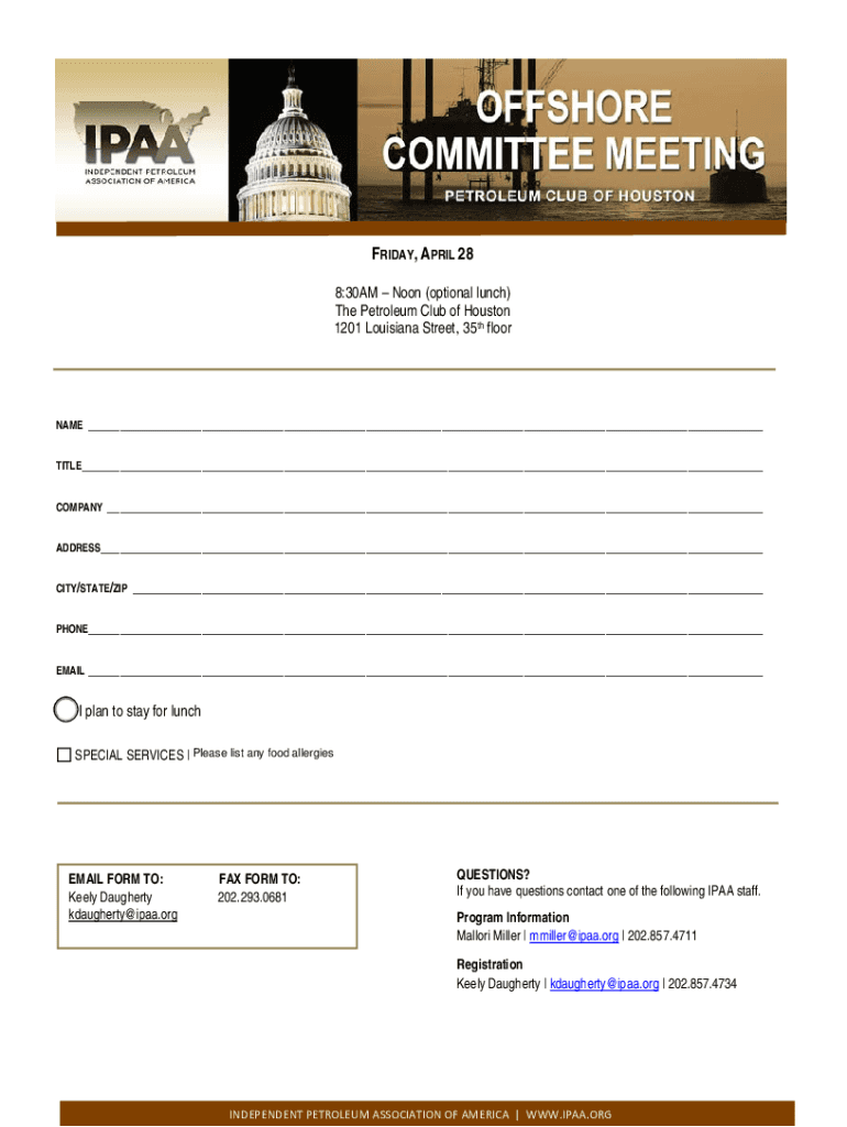 FRIDAY, APRIL 28 8:30AM Noon (optional lunch) The Petroleum Club of Houston 1201 Louisiana Street, 35th filename TITLE COMPANY ADDRESS CITY/STATE/ZIP PHONE EMAIL I plan to stay for lunch SPECIAL SERVICES
