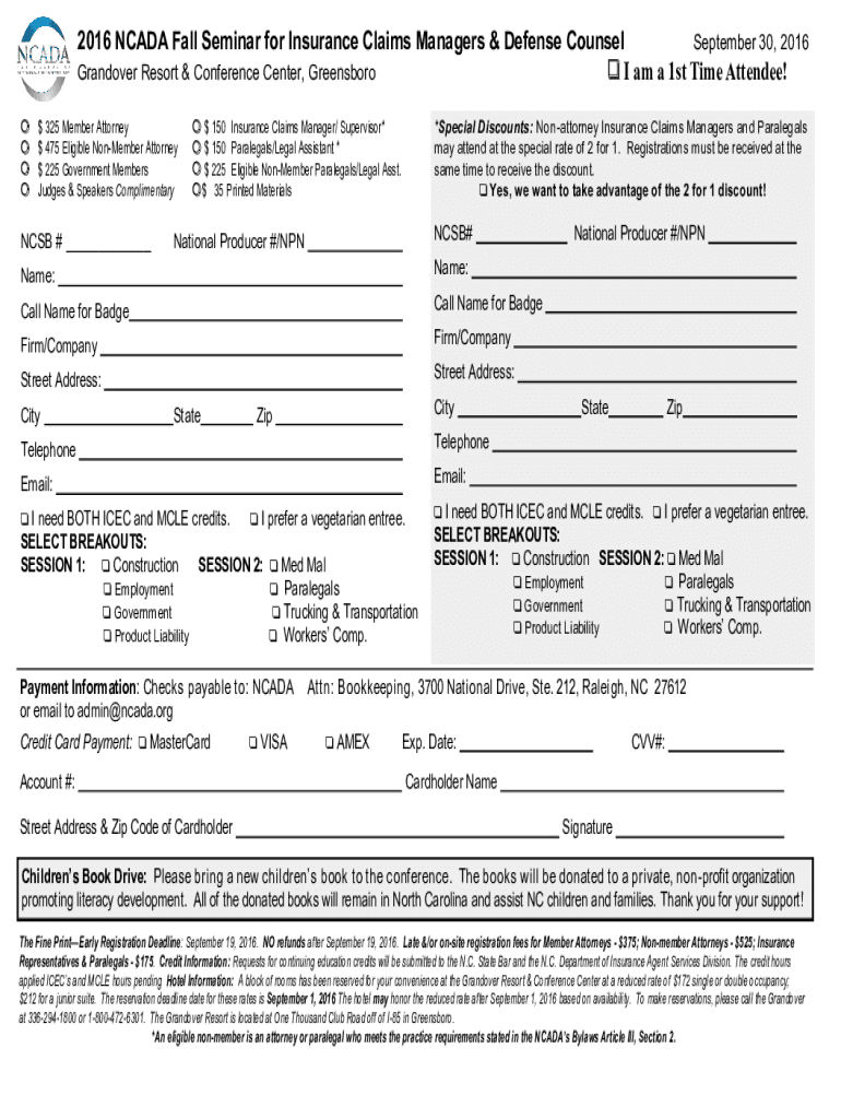 2016 NCAA Fall Seminar for Insurance Claims Managers & Defense Counsel September 30, 2016, Grand over Resort & Conference Center, Greensboro I am a 1st Time Attendee! $325 Member Attorney $475 Eligible