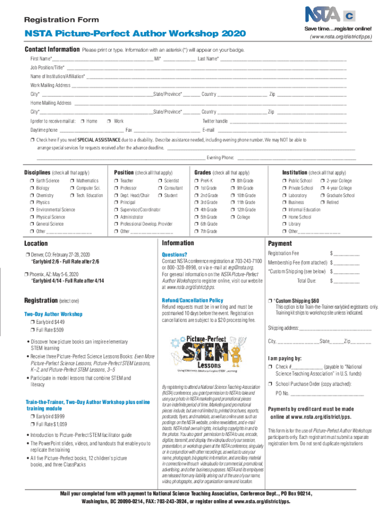 Registration Form Save time register online! (www.nsta.org/district/pps)NSA PicturePerfect Author Workshop 2020 Contact InformationPlease print or type. Information with an asterisk (*) will appear