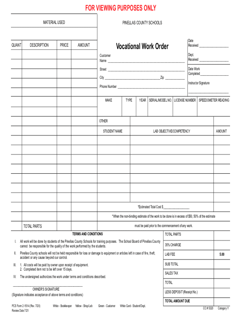 FORVIEWINGPURPOSESONLY MATERIAL USEDQUANTDESCRIPTIONPRICEPINELLAS COUNTY SCHOOLSVocational Work OrderAMOUNTDate Received Customer Name Dept. Received Street Date Work Completed City Zip Phone Number
