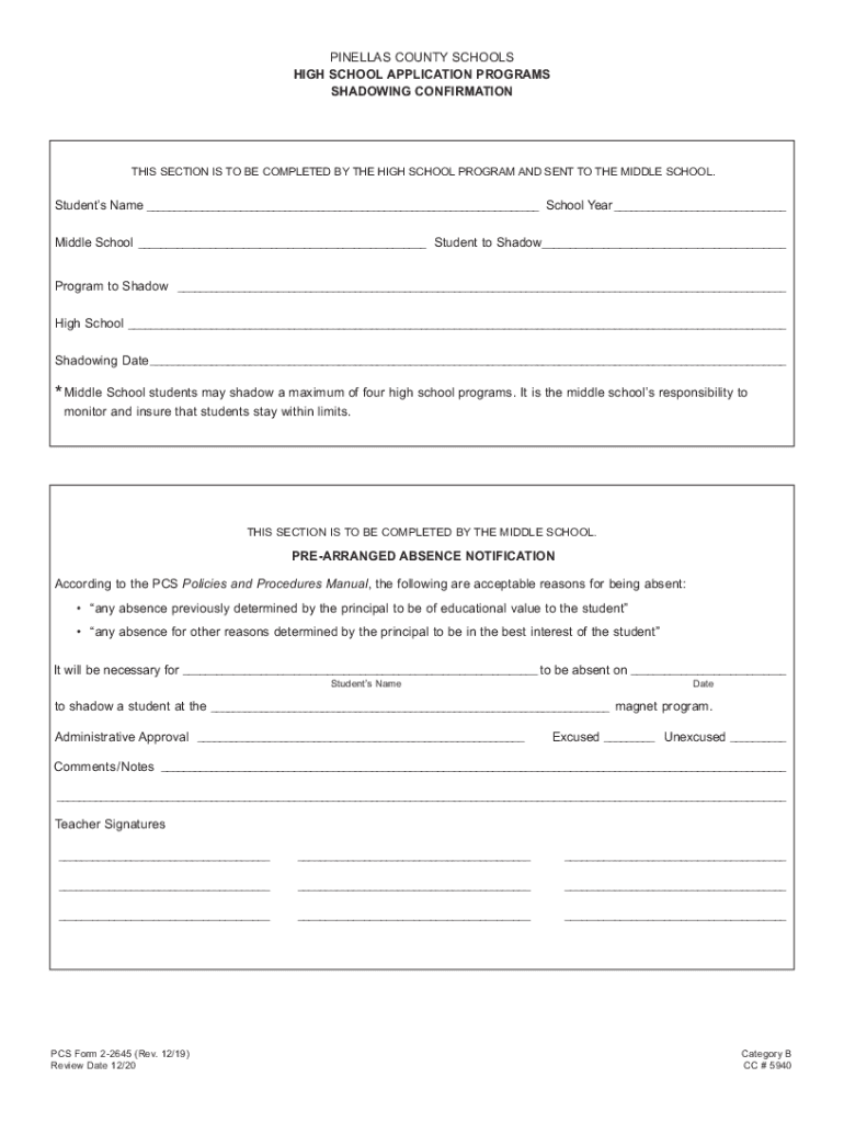 PINELLAS COUNTY SCHOOLS HIGH SCHOOL APPLICATION PROGRAMS SHADOWING CONFIRMATIONS SECTION IS TO BE COMPLETED BY THE HIGH SCHOOL PROGRAM AND SENT TO THE MIDDLE SCHOOL. Students Name School Year Middle