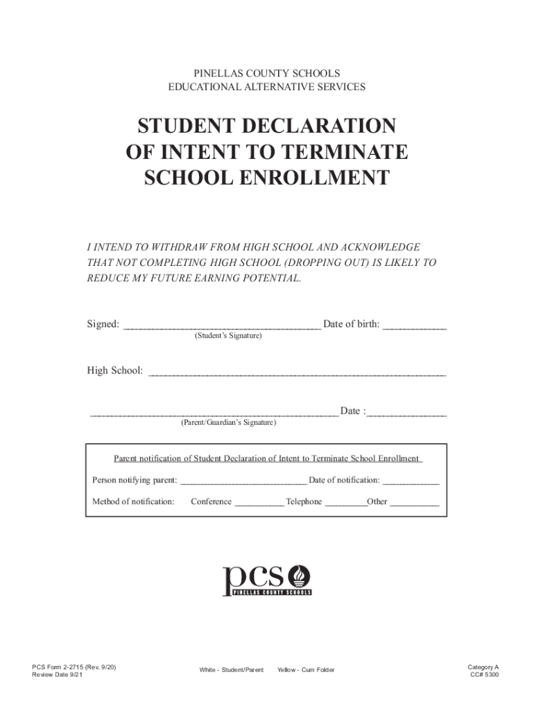 PINELLASCOUNTYSCHOOLS EDUCATIONAL ALTERNATIVE SERVICESSTUDENTDECLARATION OFINTENTTOTERMINATE SCHOOLENROLLMENT INTEND TO WITHDRAW FROM HIGH SCHOOL AND ACKNOWLEDGE THAT NOT COMPLETING HIGH SCHOOL (DROPPING