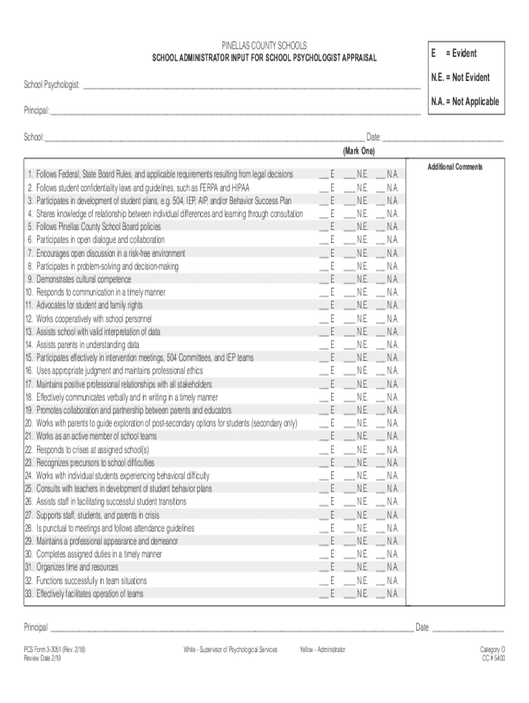PINELLAS COUNTY SCHOOLS School Administrator input for School psychologist Appraisal School Psychologist: Principal: E Evident. E. Not Evident N.A. Not ApplicableSchool: Date: (mark one) 1. 2. 3.