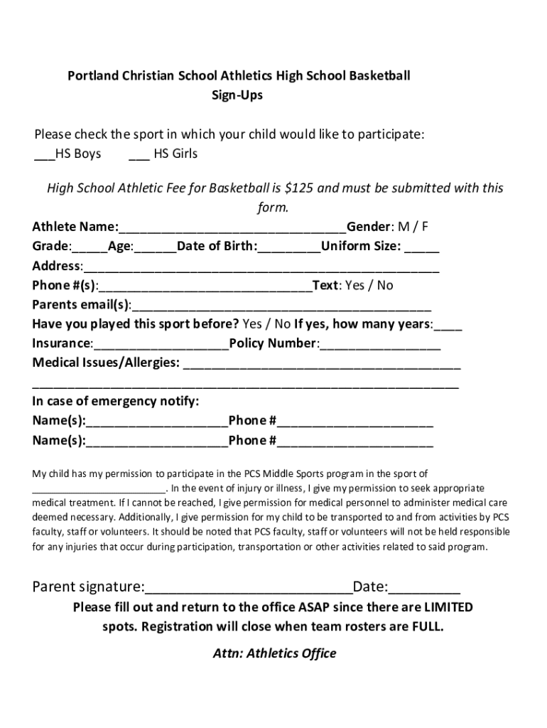 Portland Christian School Athletics High School Basketball Sign-ups Please check the sport in which your child would like to participate: HS Boys HS Girls High School Athletic Fee for Basketball is