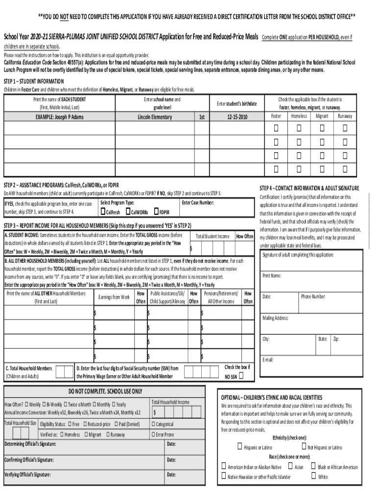 **YOU DO NOT NEED TO COMPLETE THIS APPLICATION IF YOU HAVE ALREADY RECEIVED A DIRECT CERTIFICATION LETTER FROM THE SCHOOL DISTRICT OFFICE**School Year 202021 SIERRAPLUMAS JOINT UNIFIED SCHOOL DISTRICT