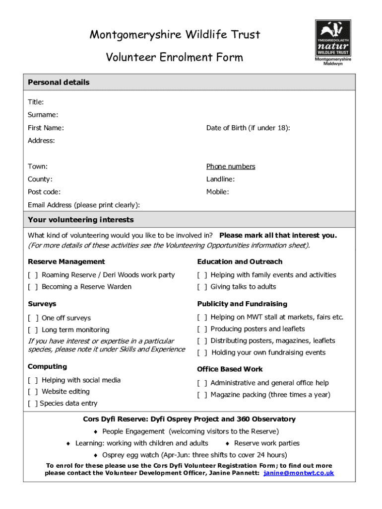Montgomery shire Wildlife Trust Volunteer Enrollment Form Personal details Title: Surname: First Name:Date of Birth (if under 18):Address:Town:Phone numbersCounty:Landline:Post code:Mobile:Email Address