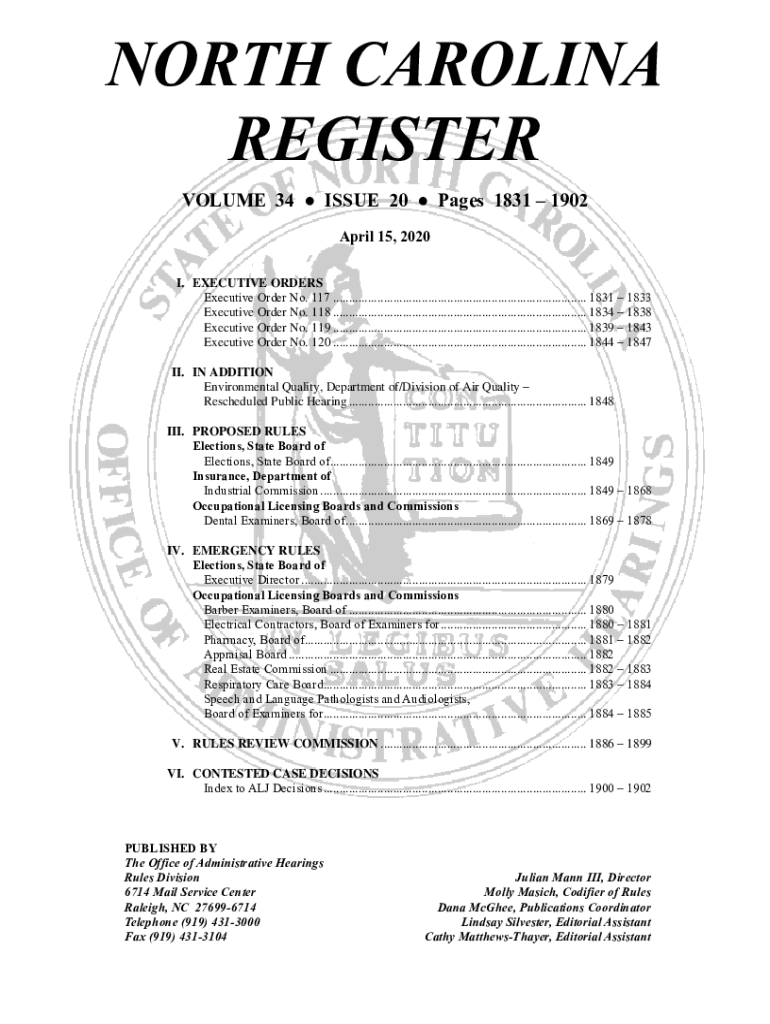 NORTH CAROLINA REGISTER VOLUME 34 ISSUE 20 Pages 1831 1902 April 15, 2020, I. EXECUTIVE ORDERS Executive Order No. 117 ................................................................................