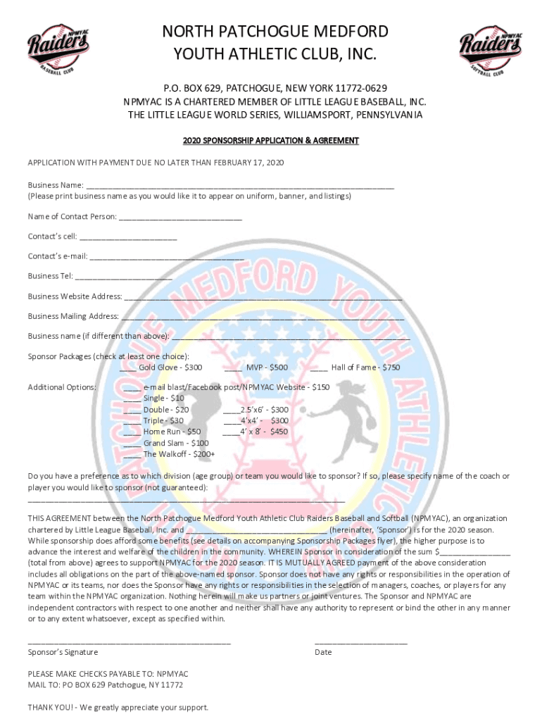 NORTH PATHOGEN MEDFORD YOUTH ATHLETIC CLUB, INC. P.O. BOX 629, PATHOGEN, NEW YORK 117720629 MAC IS A CHARTERED MEMBER OF LITTLE LEAGUE BASEBALL, INC. THE LITTLE LEAGUE WORLD SERIES, WILLIAMSPORT,
